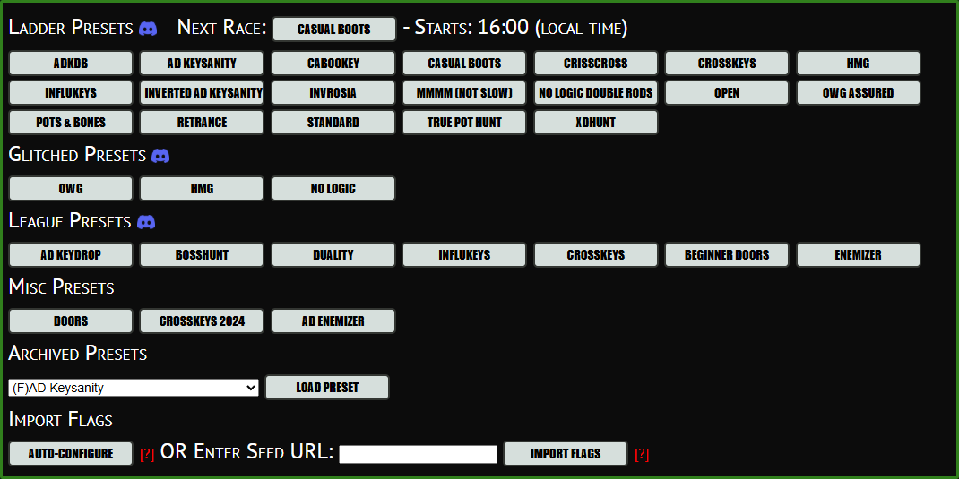 If you want to manually adjust your flags, the Gameplay Settings, Logic Settings, Goal Settings, and Starting Items can be adjusted to whatever mode you want. You can click on the header to expand the categories and adjust any flag that you want. If there are incompatibility issues with any of the modes, it will alert you when you start the tracker. Some modes have notes associated with them, which you can see by hovering over the [?] icons.
