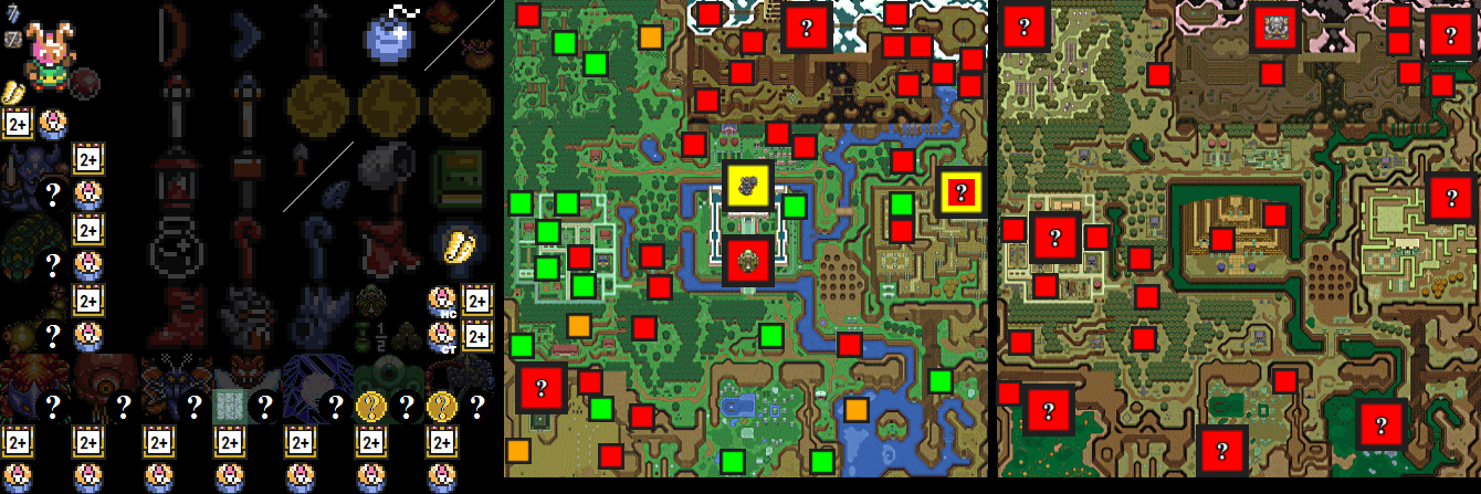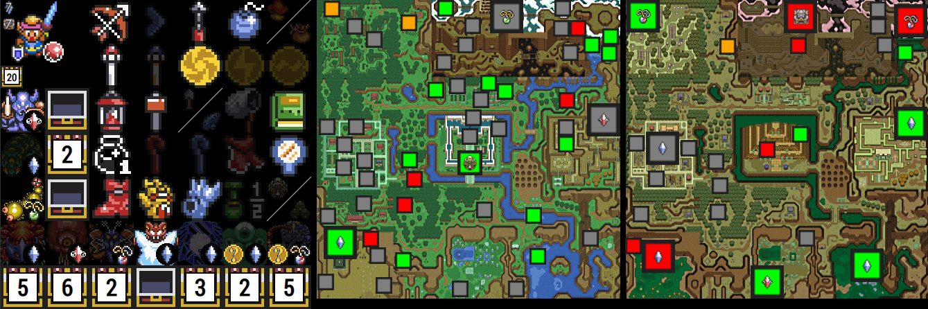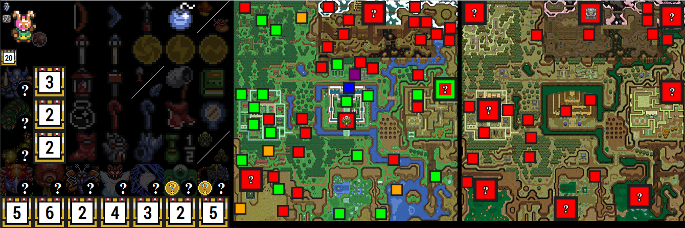 Each dungeon is color code with an outer and inner color. The outer color is for items in the dungeon, and will change based off obtained items and when the item tracker's dungeon chest count changes, and matches the same color coding. (NOTE: Orange is not an option in dungeons, so items like the torch item in DP will be shown as red without Boots) The inner square shows a ? icon by default, and will rotate through pendants, crystals, and potentially maps, as you cycle through the icons next to the dungeons in the item tracker. The color coding in the inner square matches the same color coding and shows if the boss can be defeated or not. Clicking on each overworld location will check off if you have cleared the location or not. Clicking on the dungeon chests and dungeon icons on the item tracker will change the status of the dungeon locations on the map. Also, hovering over each location will show a text description of what each location is under the map.