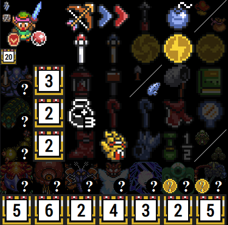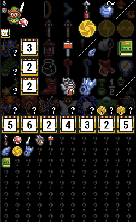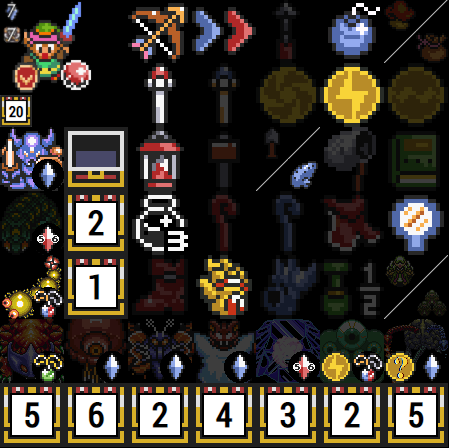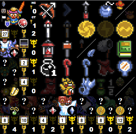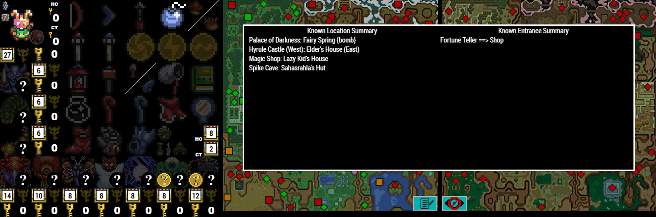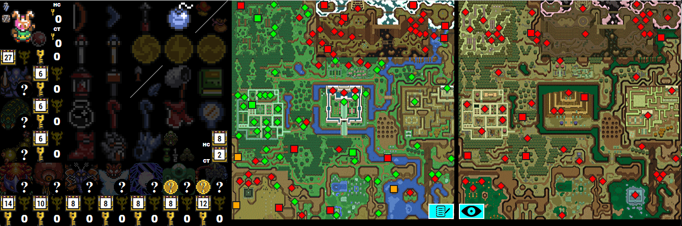 If more advanced flags are set, more icons will show up as available on the item tracker. The ? icon to the top left of each dungeon is for enemy shuffle mode and can be cycled through with all of the possible bosses with left and right clicking. This is more important for information and if you are using the map tracker, to show which bosses can and cannot be defeated. If wild keys or wild big keys are active, the chest icon will become smaller, but will function the same way with left and right clicks. If wild keys are active, there will be a count of your current small key count next to the key icon. This can be toggled with left and right clicks. If Retro mode is active, this will always override the wild small key flag, and will start with the maximum number of keys for each dungeon. These will decrement and increment backwards as wild keys, as it can be used to mark how many keys are required to clear each dungeon. Hyrule Castle and Castle Tower small keys are located to the right of the sprite and are marked with HC and CT headers. If wild big keys are selected, the big key icon will be shown next to each dungeon and can be clicked on to check on and off.