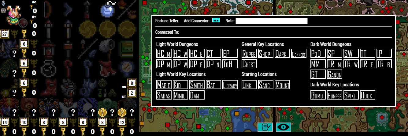 By left clicking on an entrance, it will check the entrance as cleared. To simplify the busy nature of the map in entrance mode, the icon is shown as a mostly invisible grey diamond. You can click on it again to re-show it, but this feature is to make the map more readable as your race progresses. Clicking on the squares for overworld locations will check off those locations as well. If you right click on an entrance, it will pull up an entrance menu. From here, you can perform various functions on the entrance. The name of the entrance will be at the top left of the menu. To the right of that will be an option to Add a Connector. More on how this works below. To the right of that will be a Note field, where you can type in a note about the location and press enter or click off of the menu, which will save the note. A small ? box will show up on the map above that location, which can be hovered over to show what the note says below the map. If there is a connector already established at the location, it will show the connected information in the Connected To line. Those connectors can be removed by clicking on the disconnect icon next to the name of the location. The bottom half of the menu will have a list of dungeons, key locations, and starting locations. By clicking on one of these, it will flag the location as an important location and it will tag the location on the map above the entrance's diamond with what you have selected. Dungeons are color coded as pink and key locations will be color coded as blue. If you make a mistake and need to change the tag, simply right click to the menu again and you can change it to whatever you want. Key locations are important to select! For example, the logic for the dam item is dependent on selecting the Dam key location on the entrance menu. Without it, it will not know if that item is obtainable or not.