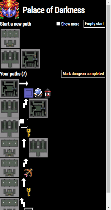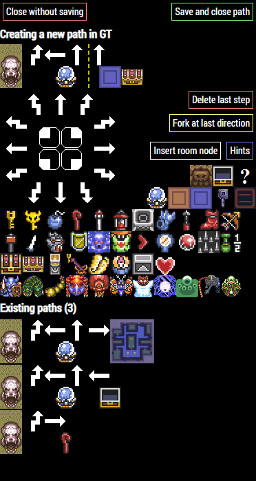 For each dungeon, as you are playing, you will be creating a list of paths. Each path consists of a concatenation of symbols (arrows, items, crystal switches and more) and complex or special rooms or entrances.