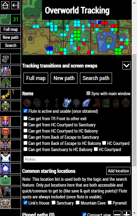 When Door Shuffle is enabled, click on the map icon next to the player sprite to open a new window with the Dungeon Tracker. If you have more space, we recommend enlarging this window so that more and longer paths can fit in there without needing to scroll.