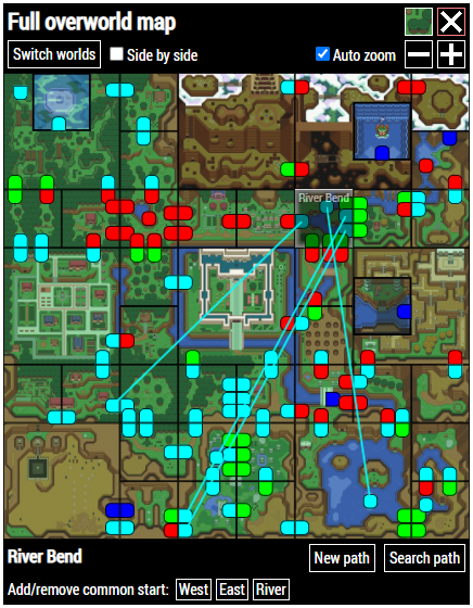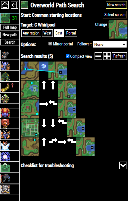 If you want to get back to a screen you have previously found, click on a button labelled Search path or Search and select a screen or preset. If you're already on the Full map, you can also select a screen first and then click on Search path below the map.The tracker will then compile a list of paths from all possible common starting locations (including flute spots if the flute is usable) to the selected target screen.
