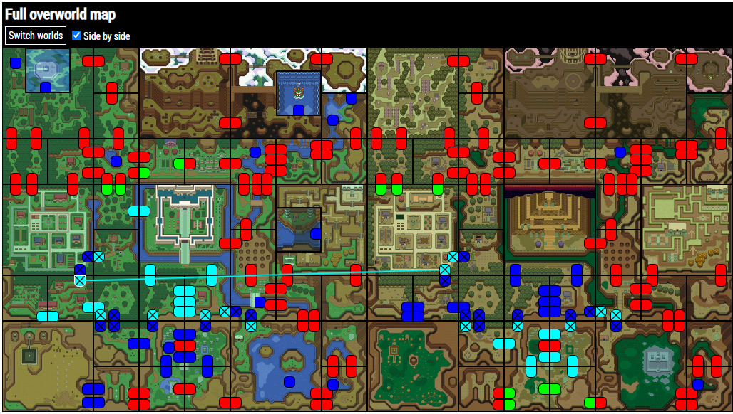 Tip: If you're unsure if you're currently looking at the Light World or Dark World map in the tracker, pay attention to the tree in the bottom-left corner in the desert/mire area. It will either be a Light World or Dark World tree depending on which world is being displayed behind it.