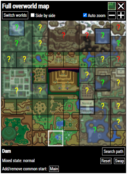 In Mixed, every overworld screen is in one of two states: normal or swapped. If it's in swapped state, the screen version that normally belongs to the Dark World is now part of the Light World.Open the Full map which can be accessed from the Overworld Tracking page, window main page or sidebar. This will open a large overworld map and show you which screen states have been tracked so far and which versions (Light and Dark World) belong to which world.