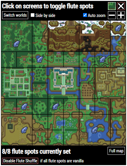 When Flute Shuffle is active, you need to tell the tracker where your flute spots are. Each overworld screen only has one possible position for a flute spot, so all you need to determine is which 8 screens contain a flute spot which you can tell just from looking at the flute menu.When you use the flute for the first time and you have marked your flute as activated in the tracker, the Kakariko screen on the Full map should have a Set flute spots button that brings you to the flute spot menu. Alternatively, you can click on Edit flute spots in the Overworld Tracking menu to access the flute spot menu.