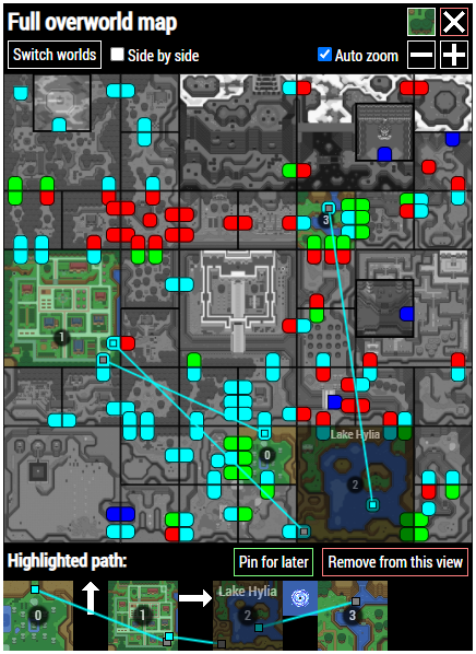 Click on a path to view it with more details and lines connecting the edges of the screens. You can also click on View on map to attach the path to the full overworld map, highlighting screens that are on the path and numbering them, or Pin for later to permanently display it in a list on the Overworld Tracking page.