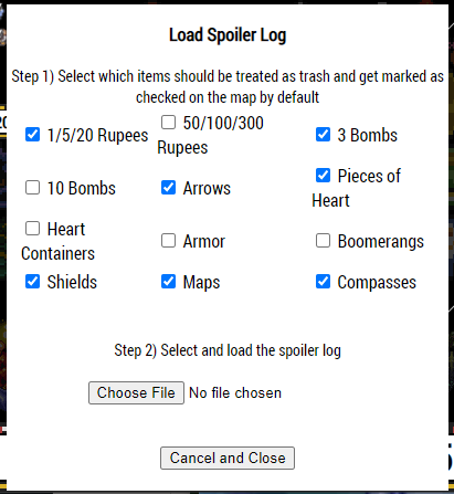 Spoiler log This will allow you to upload a non-race version of the spoiler log, provided by the ALTTPR generator. This will give you an additional screen upon loading the tracker where you can upload your spoiler log and select items that you'd like to have ignored. Anything ignored will have their spots unchecked from the map tracker, and locations with what items are available will be noted when you hover over them.