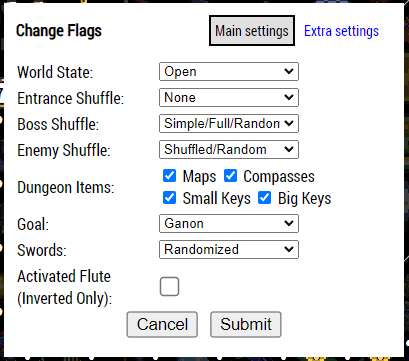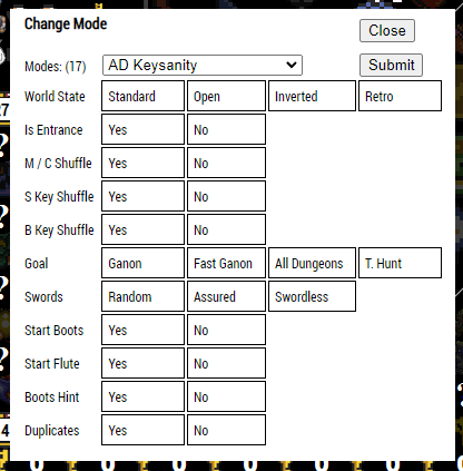 If the Mystery flag is active, there is a flag icon under the goal icon to the left of the sprite. Clicking on this icon will bring up an extra Mystery menu where you can change any of the flags that were selected from the launcher. This is so you can adjust the flags when you discover what each mode is. After clicking on Submit, any changes to the tracker will be made immediately. If you switch between Inverted and any non-Inverted World State, and you are using the map tracker, any checked off locations will also be reset.